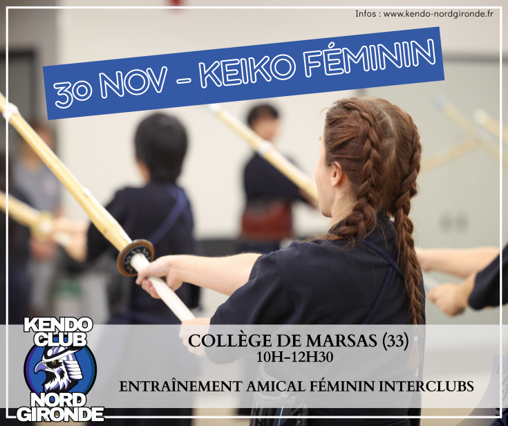 Le Kendo Club Nord Gironde (KCNG) a le plaisir d’inviter les pratiquantes au premier Entraînement féminin amical (godo-geiko) de la saison. Il s’agit avant tout de créer du lien entre les pratiquantes de Gironde et Nouvelle-Aquitaine : toutes les licenciées sont les bienvenues, quelque soit l’âge ou le grade.